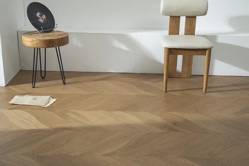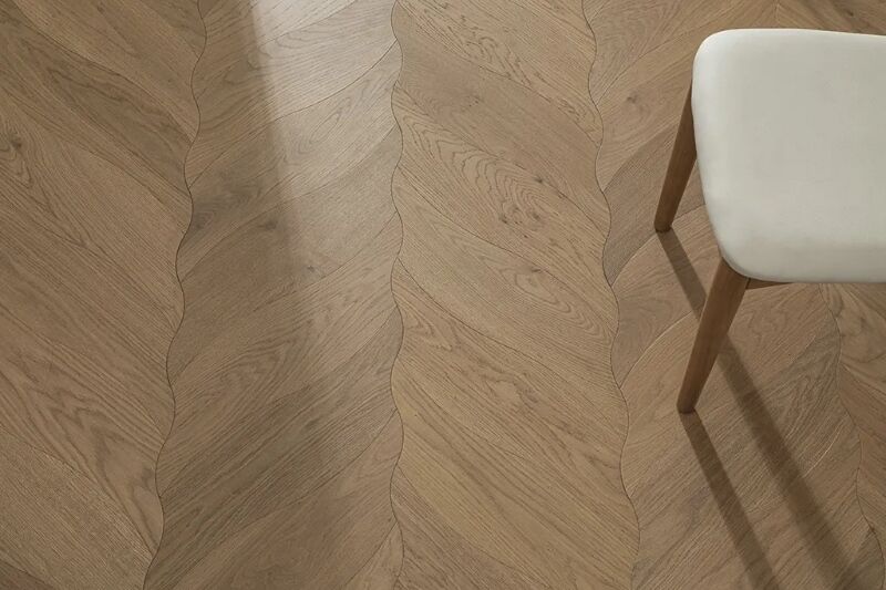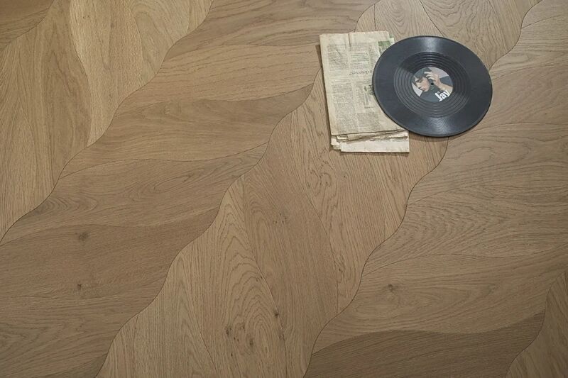 El suelo está compuesto por bloques de madera individuales dispuestos en un motivo de hojas repetidas. Cada “ hoja” está formada por tonos contrastantes de madera, destacando las venas y los contornos, lo que resulta en una superficie dinámica y texturizada que agrega profundidad y arte a cualquier habitación.