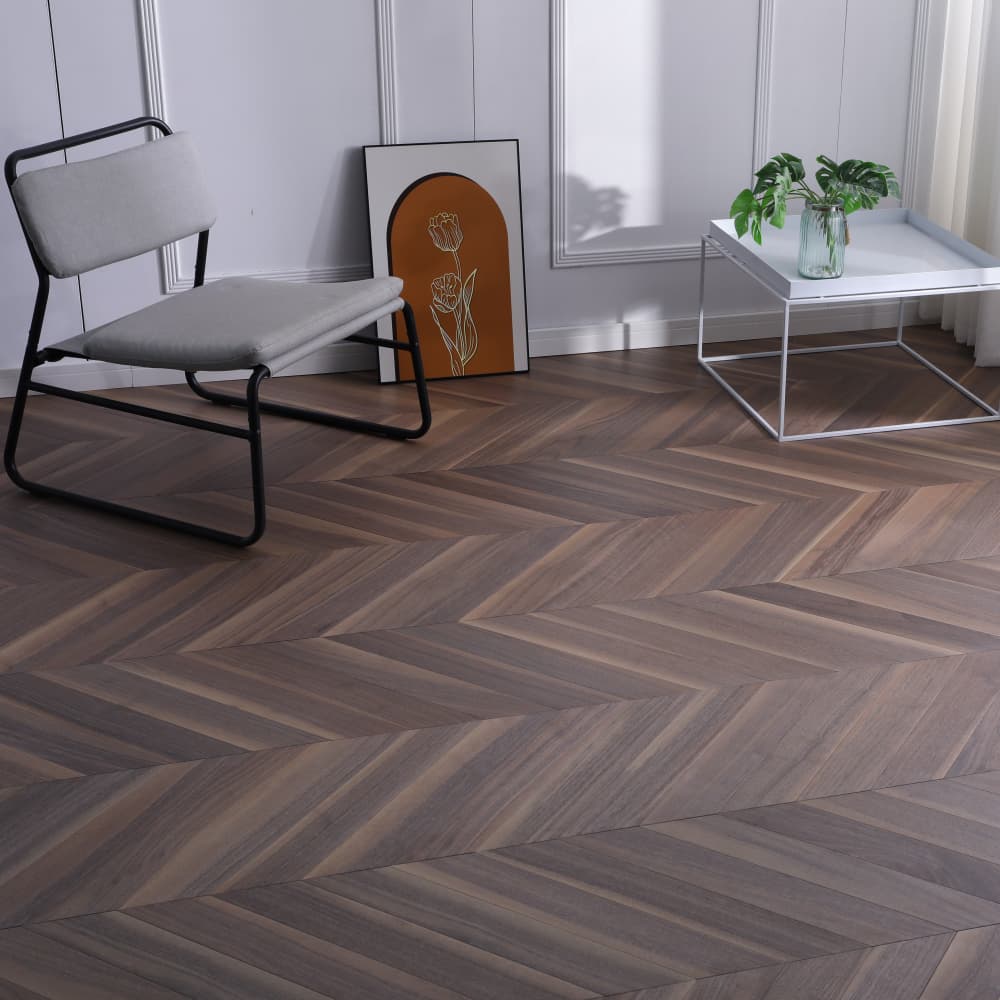 Premium Chevron Engineered Wood Flooring in Oak & Walnut, 15mm thickness with 510x92mm/530x127mm sizes. Ideal for luxury hotels & retail spaces, featuring waterproof core and 25-year warranty. Custom sizes available.