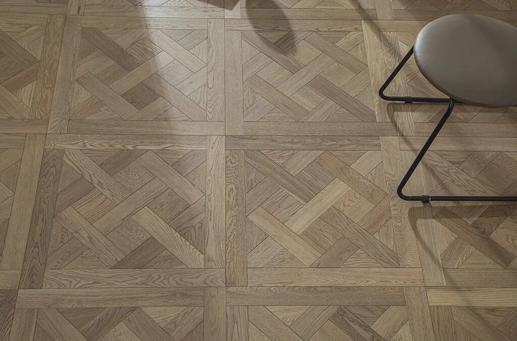 Versailles engineered wood parquet, crafted in oak veneer with a timeless French palace design. Size: 600×600×15/1.2mm, elegant and durable, ideal for upscale interiors.