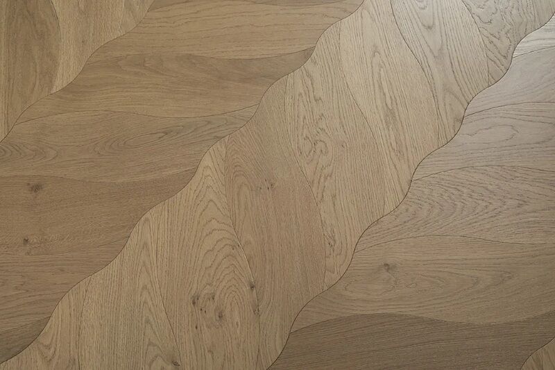 The floor is composed of individual wood blocks arranged in a repeating leaf motif. Each “leaf” is formed by contrasting tones of wood, highlighting the veins and contours, resulting in a dynamic and textured surface that adds depth and artistry to any room.